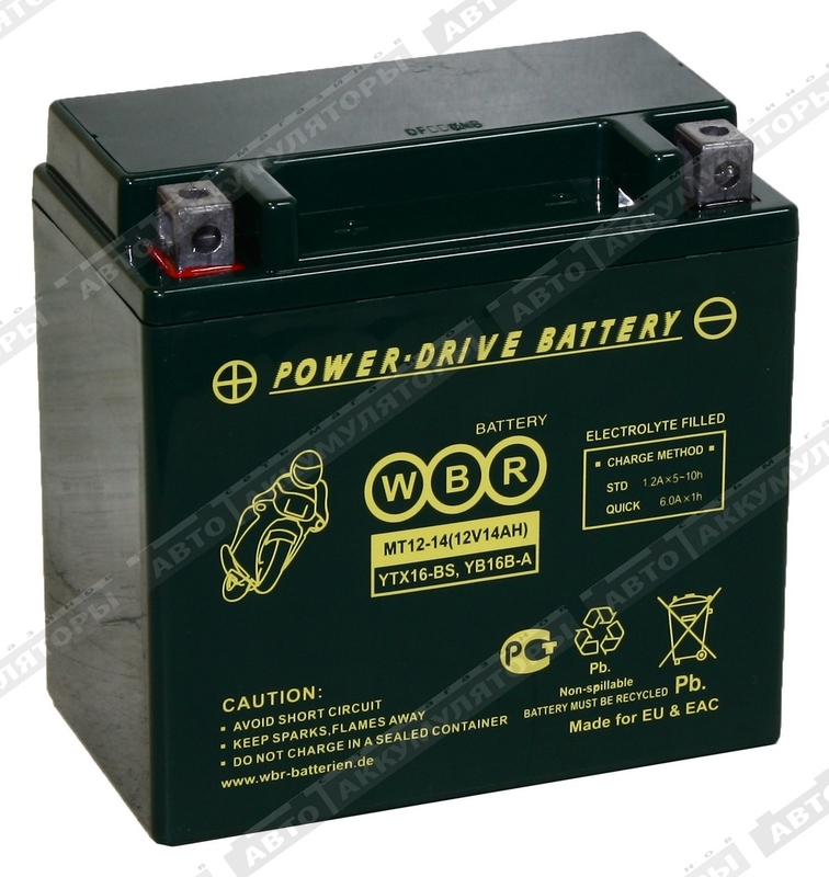 Герметизированные, выполненные по технологии AGM, необслуживаемые (MF) стартерные мотоциклетные свинцово-кислотные аккумуляторы WBR МТ12-14 обладают высоким качеством и надежностью. Они предназначены для запуска двигателя мотоциклов, скутеров, гидроциклов, квадроциклов, снегоходов и мотовездеходов. Батареи соответствуют техническим характеристикам и являются аналогом мотоциклетных аккумуляторных батарей YUASA моделей YTX16-BS, YB16B-A.