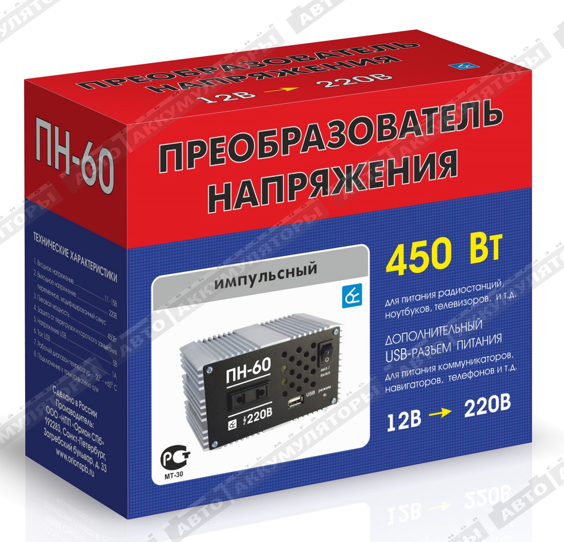 Импульсный преобразователь напряжения Вымпел ПН-60, он же инвертор, служит для преобразования напряжения 12В в эффективное напряжение 220В, модифицированный синус, благодаря чему от бортовой сети автомобиля можно запитать почти любые бытовые приборы (мобильный телефон, фен, утюг, ноутбук и т.д.)